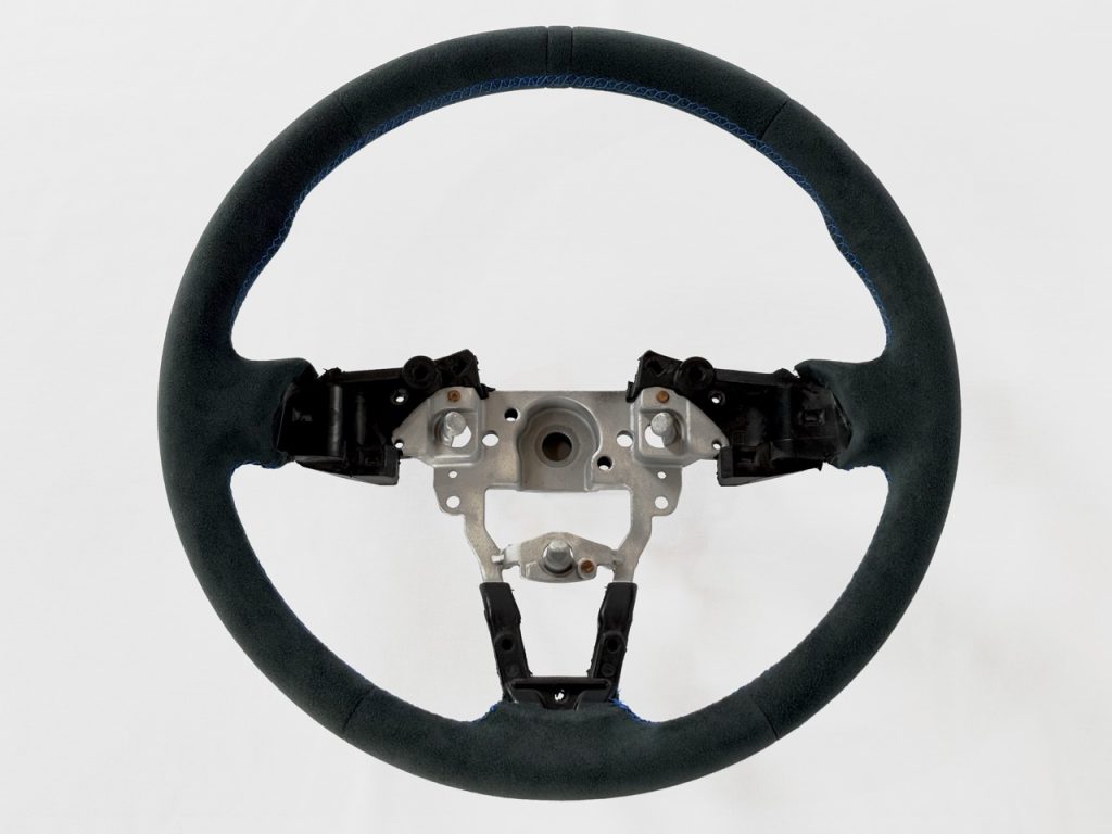 形状はノーマルと同形状なので握り易く、センターリボンはあえて同色で、ステアリング操作時のチラつきを防止。